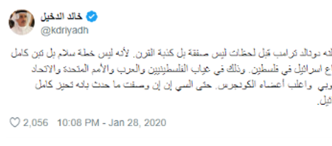 وعلى موقع "تويتر"، تصدر وسم #القدس_عاصمة_فلسطين ووسم #بصقة_القرن قائمة الوسوم الأكثر تداولاً. وعبر عدد من المغردين عن رفضهم لخطة السلام بين إسرائيل والفلسطينيين، وذلك لأنها جاءت مخالفة للمفهوم الحقيقي للصفقة، والذي يفيد تحقيق مكاسب للطرفين، كما كتب خالد الدخيل في تغريدة على حسابه: