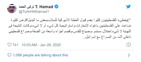ومن وجهة نظر الكاتب السعودي تركي الحمد، فغرد مشيراً أنه "من الخطأ عدم قبول الخطة الأمريكية"، متسائلاً عن البديل:
