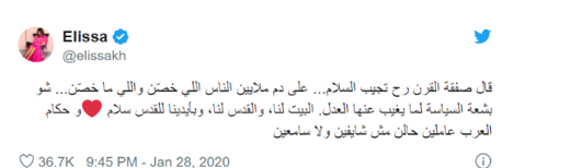 وقد تفاعل عدد من الفنانين العرب وأبدوا آرائهم "بصفقة القرن"، فغردت الفنانة اللبنانية إليسا على حسابها الخاص في موقع "تويتر"، قائلة إن "من يزعم بأن صفقة القرن ستجلب معها السلام... فسيكون على حساب دماء الملايين من الناس المعنية بالأمر أو غير المعنية"، وفق تعبيرها، وانتقدت الفنانة ما أسمته غياب العدل في السياسية: