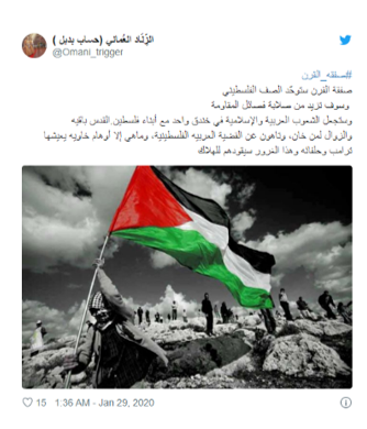وفي رأي بعض المغردين أن "خطة السلام أتت بالوقت المناسب"، فغرد ناشط يدعى الزِّنَاد العُماني قائلاً إنّ "الصفقة ستوحّد الصف الفلسطيني وسوف تزيد من صلابة فصائل المقاومة وستجعل الشعوب العربية والإسلامية في خندق واحد مع أبناء فلسطين في ظل التفرقات التي يشهدها الوطن العربي".